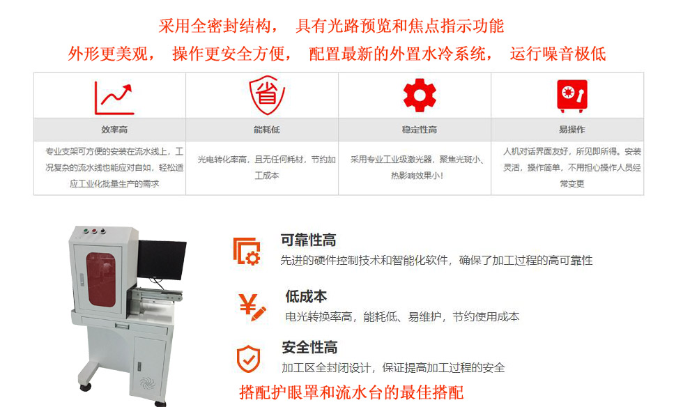 更加适合对热辐射反应大的材料进行加工;可与生产流水线配合,自动上下料,自动进出料;适合在绝大多数金属和非金属材料上打标;灵活便捷的操作系统:操作过程人性化,设备运行稳定性好;专用控制软件可兼容AutoCAD、CorelDRAW、Photoshop等多种软件输出;能实现文字符号、图形图象、条形码、二维码、序列号自动递增等的自动编排和修改;支持PLT、PCX、DXF、BMP、JPG等多种文件格式,可直接使用ttf字库;CCD自动识别跟踪定位;