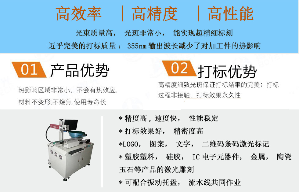 聚焦光斑极小、加工热影响微乎其微、超精细打标、特殊材料打标、不会产生热效应、不会产生材料烧焦问题。